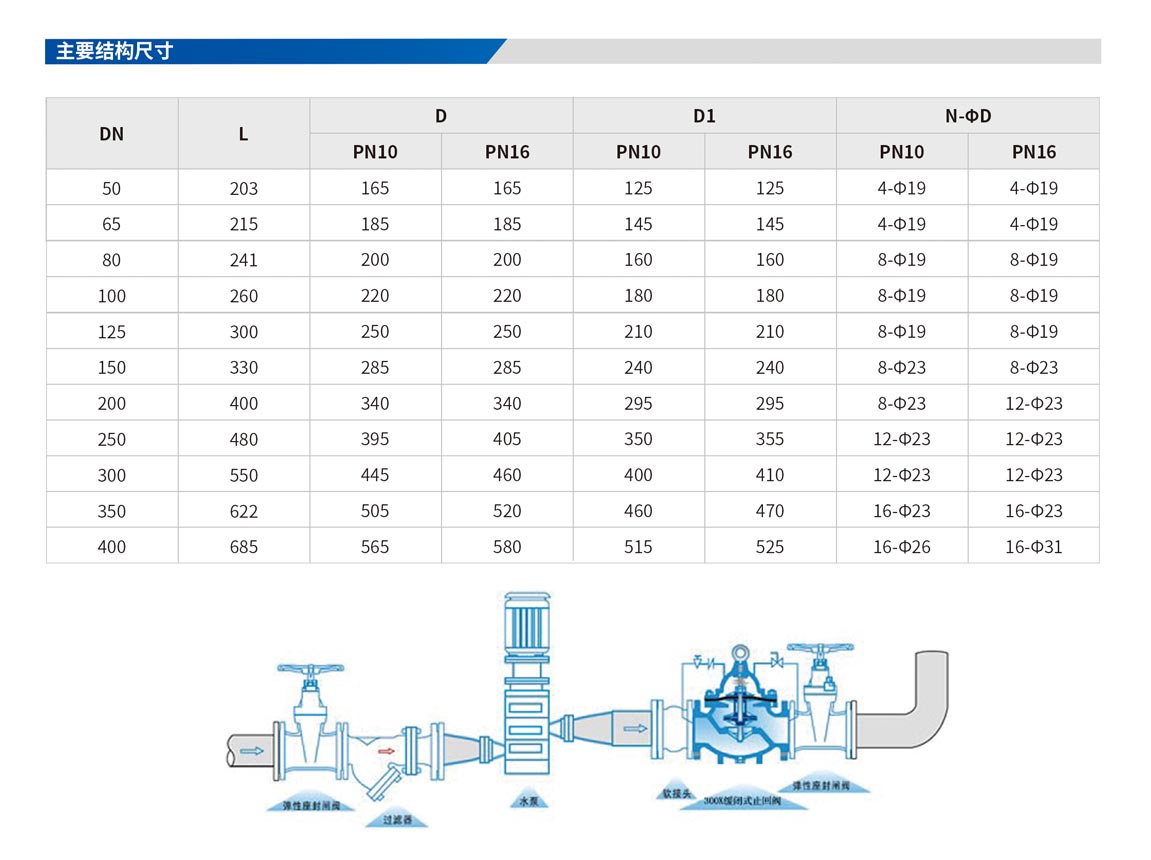 具有開啟和關閉速度調控的逆止閥,于啟動或停止抽水機運轉時,可配合現場調節至開啟或關閉速度。可用于高層建筑,減少水錘及水聲現象產生,以達安靜關閉之效果。 公稱壓力∶PNI0、PNI6、PN25 隔膜式∶DN50~DN500