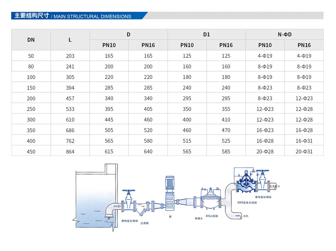 900X緊急關閉閥,是一種用于消防用水與生活用水并聯的供水系統中,用來調配供水方向的閥門。當火災發生時,消防急需大量用水,900X緊急關閉閥立即切斷生活用水,確保足夠的消防用水:當消防停止用水壓力減小時,閥門自動打開,呈常開狀態,恢復生活供水。該閥使系統無須另設專門的消防單獨供水管網,大大地節約了建設成本和用水量。閥門控制靈敏度高,安全可靠,調試簡便,使用壽命長。